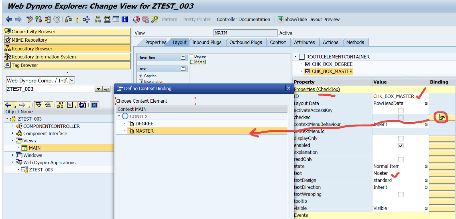 Create a web dynpro component & add two attributes ( type CHAR01 ) under the context node ( want to show two check boxes).